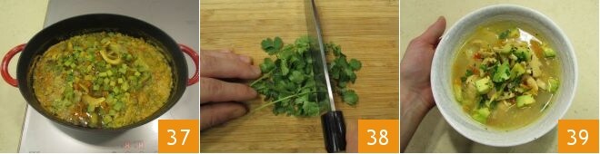 Decorrido o tempo de cozimento, retire a sopa do fogão 37, depois lave e pique o coentro fresco 38. Divida a sopa nos pratos e polvilhe com o coentro picado: sua saborosa sopa de frango e abacate está pronta para ser servida 39!