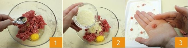 Para realizar os spaghetti alla chitarra com almôndegas, comece pelas almôndegas: em uma tigela coloque a carne moída, o ovo, a pimenta 1, o queijo 2, o sal e uma pitada de noz-moscada. Misture com as mãos para integrar os ingredientes e forme as almôndegas, ou seja, pequenas bolinhas que não devem ser maiores que 1 cm 3.