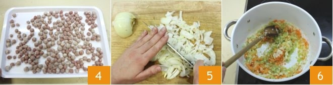 À medida que formar as almôndegas, coloque-as em uma bandeja enfarinhada 4, depois cubra com filme plástico e reserve. Agora cuide do molho de carne: pique finamente o aipo, a cenoura e a cebola 5 e refogue lentamente com um fio de óleo 6.