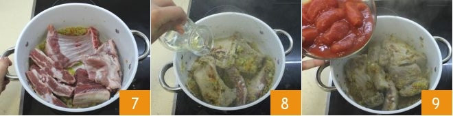 Adicione a carne 7 e deixe dourar bem, depois regue com o vinho branco 8, deixe evaporar por um momento e depois adicione os tomates pelados 9.
