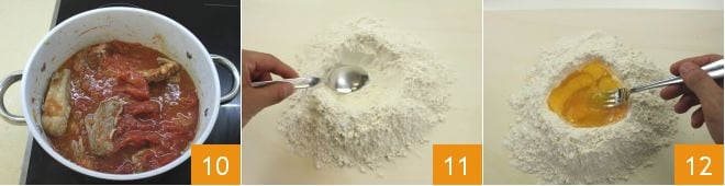Misture para dar sabor à carne 10, salgue e apimente, cubra com uma tampa e deixe cozinhar por cerca de 3 horas. Enquanto isso, prepare a massa de ovo: peneire a farinha em uma tigela, então disponha-a em forma de fonte sobre a bancada, depois faça um buraco no centro 11 e despeje os ovos 12 que você manteve em temperatura ambiente.