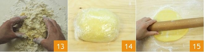 Começando pelo interior, misture os ovos com um garfo ou com uma colher, pegando aos poucos a farinha das bordas; depois trabalhe com as mãos a massa 13 de fora para dentro, integrando toda a farinha que está na bancada. Em seguida, envolva a massa obtida no filme plástico 14 e deixe-a descansar por cerca de 1 hora em um local fresco e seco. Após o descanso, a massa fresca ficará mais macia e elástica: prepare-se então para estendê-la. Enfarinhe a bancada e pegue um rolo. Antes de estendê-la, achate o seu bloco pressionando levemente com os dedos, estenda a folha com o rolo até que fique com cerca de 0,5 cm de espessura 15.
