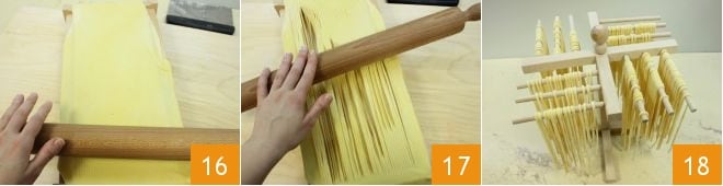 Uma vez formada a folha, enfarinhe-a bem e depois coloque-a sobre a "chitarra" 16. Passe o rolo por cima para cortar a massa 17. Enfarinhe bem e coloque-a sobre um varal de massa de madeira 18 ou forme um ninho que você colocará em uma bandeja com papel manteiga enfarinhado ou um pano, também enfarinhado.