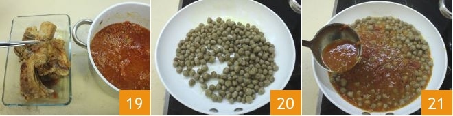 Retire os pedaços de carne cozidos no molho e reserve 19, coloque as almôndegas em uma frigideira e salteie por alguns minutos com um fio de óleo 20, depois adicione o molho sem os pedaços de carne 21.