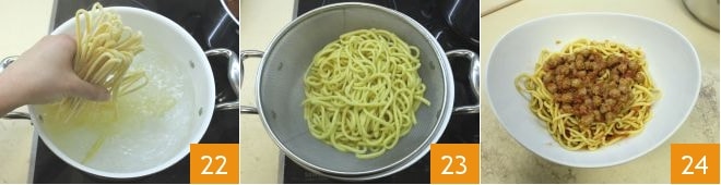 Coloque no fogo uma panela cheia de água salgada e deixe ferver, adicione os spaghetti 22 e cozinhe por cerca de 5 minutos. Escorra a massa 23 e tempere com o molho 24, excluindo a carne, que você pode usar para acompanhar o prato.