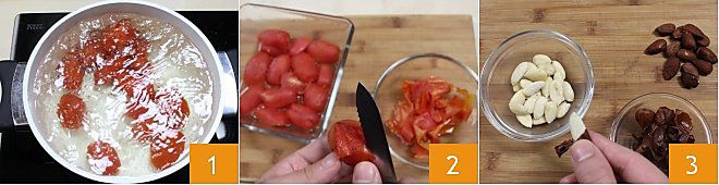 Para preparar os spaghetti com o pesto à trapanese, siga a receita do Pesto alla trapanese. Primeiro, prepare os tomates pelados: coloque no fogo uma panela cheia de água. Lave os tomates e faça um corte em cruz na extremidade de cada um. Quando a água começar a ferver, escalde os tomates por 2-3 minutos 1, depois descasque os tomates 2 e corte-os em cubos. Em seguida, pele as amêndoas: escalde-as por alguns minutos em água fervente, escorra e depois basta aplicar uma leve pressão com os dedos para remover a casca 3.