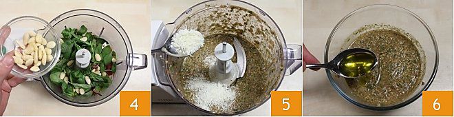 Coloque em um mixer, ou melhor, em um pilão, os tomates pelados, o maço de manjericão lavado e seco, as amêndoas 4, um dente de alho e bata tudo por alguns minutos. Adicione o queijo pecorino ralado 5 e transfira a mistura para uma tigela. Ajuste o sal e a pimenta, adicione algumas colheres de sopa de azeite 6, misture bem tudo e transfira o pesto para uma tigela grande onde você temperará os spaghetti. Se estiver muito seco, adicione mais azeite.