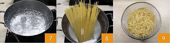 Agora cuide da massa: coloque no fogo uma panela de fundo alto adequada para cozinhar os spaghetti, uma vez que a água estiver fervendo 7, adicione os spaghetti 8. Cozinhe a massa al dente e depois escorra-os 9.
