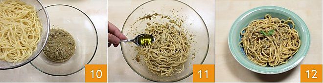 Adicione-os ao pesto à trapanese 10, misture para amalgamar bem o molho, tempere com um fio de azeite 11 e sirva seus spaghetti com o pesto à trapanese, decorados a gosto com folhas de manjericão fresco 12.