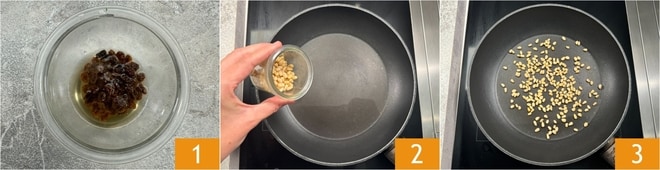 Para preparar o strudel de maçã com massa folhada, primeiro coloque as passas de molho em pouca água. Enquanto isso, coloque os pinhões em uma frigideira antiaderente 2 e toste-os por cerca de 3 minutos, ou até que fiquem dourados, tomando cuidado para não queimá-los 3.