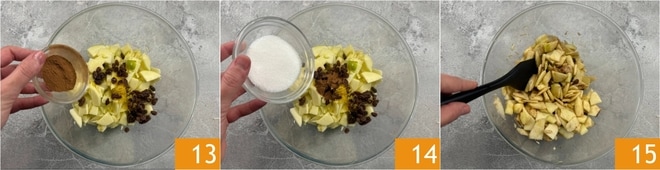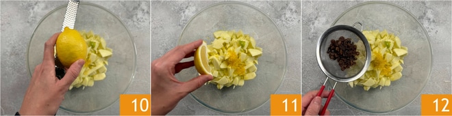 Transfira as maçãs cortadas para uma tigela, depois adicione a casca de limão ralada 10, o suco de um gomo 11 e as passas escorridas 12.