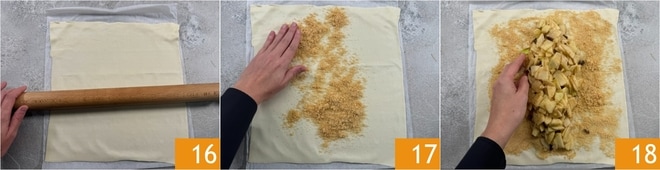 Você está pronto para montar o strudel: tire a massa folhada da geladeira e coloque-a sobre a superfície de trabalho com seu papel manteiga, mantendo o lado mais comprido voltado para você, depois estenda-a delicadamente com o rolo até quase formar um quadrado 16. Polvilhe a superfície com a farinha de rosca, cuidando para deixar um espaço livre em torno das bordas 17, depois coloque as maçãs no centro, ajudando-se com as mãos ou com uma espátula para formar uma espécie de rolo 18.