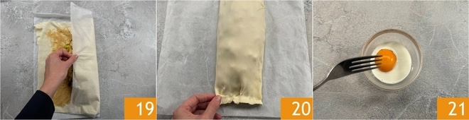 Nesse ponto, levante as bordas do papel manteiga para cobrir o recheio com a massa folhada, primeiro de um lado 19 e depois do outro. Puxe levemente a massa para que se sobreponha exatamente à primeira camada, depois pressione delicadamente a junção para fixá-la. Finalmente, vede as extremidades 20 e enrole-as para formar um cordão. Em uma tigelinha, misture a gema com o creme de leite 21.