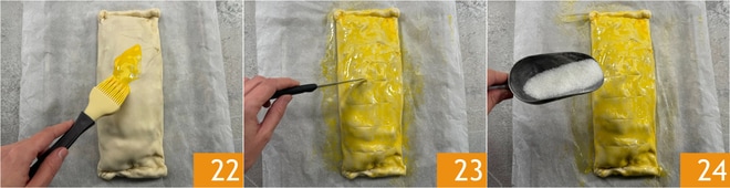 Pincele o strudel com a mistura obtida 22, depois faça cortes na superfície, cuidando para não pressionar demais, como se quisesse cortar apenas a primeira camada de massa folhada 23. Por último, polvilhe com o açúcar granulado 24. Asse o strudel no forno pré-aquecido a 180° por cerca de 40 minutos, monitorando a cozedura: se escurecer demais de um lado ou na superfície, você pode virá-lo ou movê-lo para uma prateleira mais baixa durante os últimos 10-15 minutos.