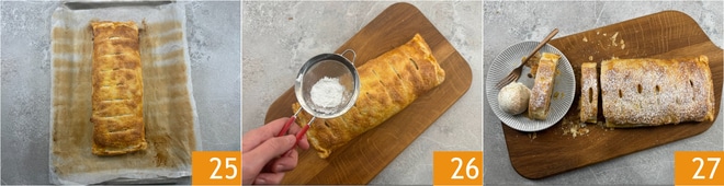 Uma vez cozido, retire do forno 25 e polvilhe com o açúcar de confeiteiro 26. Seu strudel de maçã com massa folhada está pronto para ser saboreado quente, morno ou à temperatura ambiente 27!