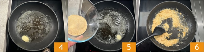 Reserve os pinhões e derreta uma noz de manteiga na mesma frigideira 4, depois adicione a farinha de rosca 5 e toste-a por cerca de 3 minutos, mexendo frequentemente 6. Quando estiver uniformemente dourada, desligue o fogo e reserve.