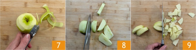 Passe para as maçãs: descasque-as 7 e corte-as em gomos 8, em seguida, corte os gomos em fatias finas do lado mais curto para obter triângulos 9.
