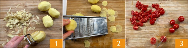 Para preparar a tiella barese (arroz, batatas e mexilhões), primeiramente descasque as batatas 1 e corte-as em fatias de 5 mm de espessura usando um mandolim 2. Lave os tomatinhos e corte-os ao meio ou em quartos, dependendo do tamanho 3.