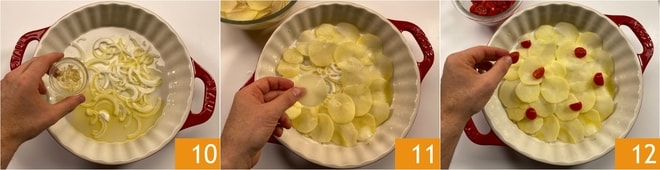 Você está pronto para montar a tiella: pegue uma assadeira com cerca de 28 cm de diâmetro (o ideal é utilizar uma panela de barro ou cerâmica) e unte o fundo com azeite, depois distribua cerca de metade da cebola e do alho 10. Coloque metade das batatas na base para formar a primeira camada 11, depois adicione alguns tomatinhos 12.