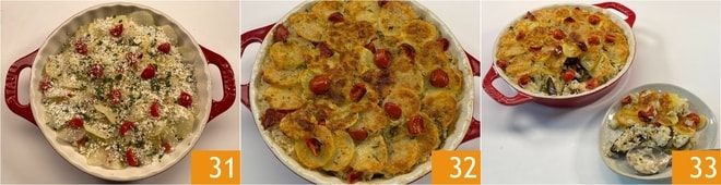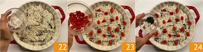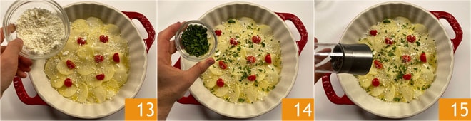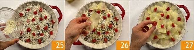 Polvilhe novamente com Pecorino 25. Forme a última camada dispondo as batatas por toda a superfície 26, depois adicione os tomatinhos restantes 27 e salsinha.