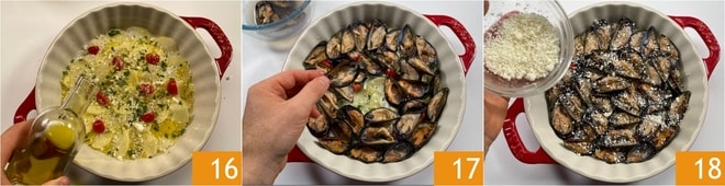 Regue com um fio de azeite 16, em seguida coloque os mexilhões com a parte da casca voltada para baixo para formar a segunda camada 17. Polvilhe novamente com um pouco de Pecorino 18.