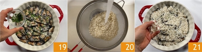 Tempere com mais salsinha 19, sal e pimenta. Neste ponto, lave bem o arroz em água corrente 20, depois distribua-o sobre os mexilhões cobrindo-os uniformemente 21.