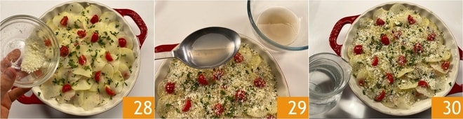 Cubra tudo com bastante Pecorino 28, depois sal e pimenta. Por último, regue a assadeira com a água filtrada dos mexilhões, tomando cuidado para despejá-la ao longo das bordas 29. Adicione também água suficiente para quase chegar ao nível da última camada de batatas 30.