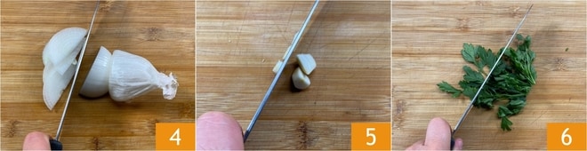 Descasque e fatie finamente a cebola 4, depois faça o mesmo com o alho 5. Por fim, pique os talos de salsinha 6.