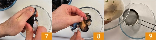 Agora cuide da Como limpar e abrir mexilhões crus: remova o bisso e esfregue a casca com uma palha de aço, depois insira a ponta de uma pequena faca afiada entre as conchas e deslize-a ao longo do lado plano do mexilhão. Comece pela ponta e continue até chegar à outra extremidade 7, depois raspe sempre com a ponta da faca para soltar o molusco de uma das conchas. Descarte a metade vazia da concha e reserve a metade com o molusco ainda preso 8. Realize essa operação colocando uma tigela embaixo para coletar a água dos mexilhões, depois filtre-a 9 e reserve.