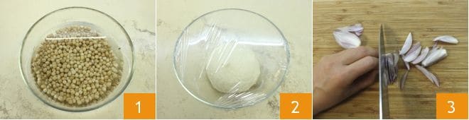 Para preparar a tigela de pão com creme de grão-de-bico, comece colocando os grãos-de-bico secos para reidratar na noite anterior: coloque-os em uma tigela, cubra com água e deixe descansar por 12 horas 1. Você também pode usar grãos-de-bico pré-cozidos, assim, você pula esta etapa. Depois disso, dedique-se à preparação da massa de pão, consultando nossa Escola de culinária: Massa para pão; alternativamente, você pode usar 10 g de fermento biológico fresco. Uma vez formada a massa, dê-lhe uma forma redonda, transfira para uma tigela, cubra-a com filme plástico e deixe fermentar em um local seco e morno por cerca de 1 hora, 1 hora e meia 2, até dobrar de volume. Em seguida, limpe e descasque a chalota e pique-a finamente 3.