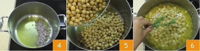 Aqueça um fio de azeite em uma panela com bordas altas e refogue a chalota picada 4. Após o tempo necessário para sua reidratação, escorra os grãos-de-bico, que estarão amolecidos, e coloque-os na panela 5. Refogue os grãos-de-bico por alguns minutos em fogo médio, depois cubra com o caldo de legumes (para saber como prepará-lo e conservá-lo da melhor forma, consulte nossa Escola de culinária: Caldo de legumes) e adicione 2 raminhos de alecrim para aromatizar 6.