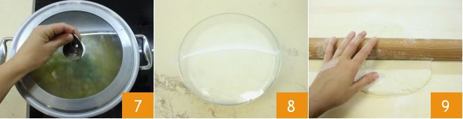 Coloque uma tampa na panela e deixe cozinhar em fogo baixo por cerca de 2 horas e meia 7. Enquanto isso, dedique-se à preparação das tigelinhas: uma vez que a massa de pão dobrar de volume 8, retire o filme plástico, transfira para uma superfície levemente enfarinhada e trabalhe com um rolo, até obter uma folha redonda com cerca de meio centímetro de espessura 9. Divida em quatro partes, ajudando-se com um cortador de massa.