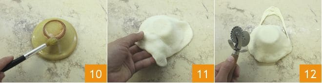 Nesse ponto, pegue 4 tigelinhas de terracota ou vidro resistente a altas temperaturas com diâmetro de 10 cm, vire-as sobre a superfície de trabalho e unte a superfície externa com um pincel 10. Em seguida, coloque a massa sobre as tigelinhas 11, fazendo-a aderir bem e eliminando as partes em excesso com um cortador de massa 12.