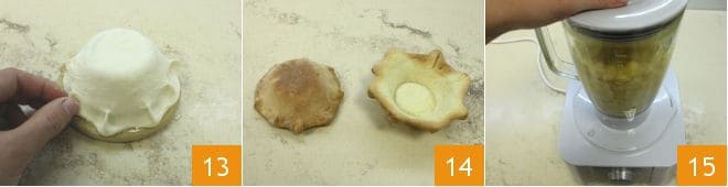 Modele as bordas das tigelinhas, formando pregas 13, então asse em forno estático pré-aquecido a 200° por 15 minutos, até que a superfície esteja levemente dourada, se usar forno ventilado, asse a 180° por 10 minutos. Em seguida, desenforme os pães e coloque-os dentro das tigelinhas, para que a parte interna também asse 14. Volte ao forno sempre a 200° por 10 minutos ou a 180° por 5 minutos se assar no forno ventilado. Enquanto as tigelinhas de pão assam, retire os raminhos de alecrim da sopa de grão-de-bico e transfira tudo para um liquidificador 15.