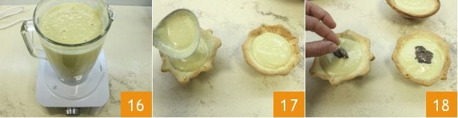 Bata por alguns segundos, até obter um composto liso e homogêneo 16. Agora, despeje o creme de grão-de-bico dentro das tigelinhas 17 e decore com lascas de trufa negra 18. Suas tigelinhas de pão com creme de grão-de-bico estão prontas para serem servidas quentes!