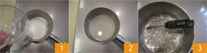 Para preparar o tiramisù da tradição, a primeira coisa a fazer é realizar o pâte à bombe. Em uma panelinha, coloque 80 g de açúcar com os 30 g de água 1. Aqueça a calda em fogo baixo 2 e, utilizando um termômetro de cozinha, mantenha sob controle a temperatura, que deverá chegar a 118°.