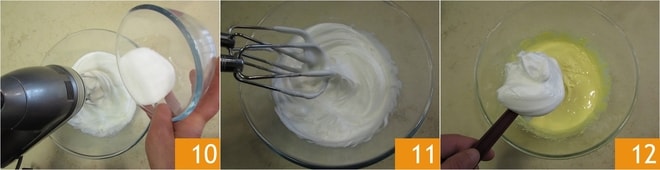 Assim que as claras estiverem brancas e espumosas, adicione os 100 g de açúcar restantes 10 e continue batendo até obter uma consistência firme e sólida 11. Adicione à mistura de gemas e mascarpone um terço das claras em neve e mexa com a espátula energicamente 12.