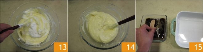 Finalize adicionando as claras restantes 13 e mexa delicadamente de cima para baixo até obter um creme homogêneo 14. Neste ponto, molhe os biscoitos champagne, um por um, no café à temperatura ambiente 15.