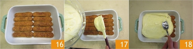 À medida que os molhar, disponha-os dentro de uma travessa grande de 25x19 cm, de forma ordenada, para cobrir toda a superfície 16. Despeje agora metade do creme 17 e nivele-o 18 para cobrir completamente os biscoitos champagne.