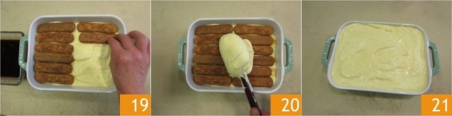 Disponha ainda uma camada de biscoitos champagne embebidos no café, como feito anteriormente 19. Adicione o creme restante 20 e nivele a superfície 21. Coloque na geladeira por pelo menos uma hora.