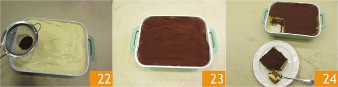 No momento de servir, polvilhe o tiramisù com o cacau em pó 22, cobrindo-o inteiramente 23. O tiramisù da tradição está pronto para ser cortado e saboreado 24.
