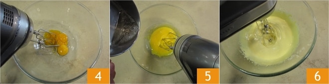Quando atingir a temperatura indicada, comece a bater as gemas com uma batedeira elétrica 4 e despeje a calda em fio sobre as gemas, mantendo as pás em ação 5. Continue batendo até que a mistura fique cremosa 6.