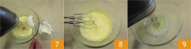 Adicione agora o mascarpone às gemas com a batedeira 7 8 ou com uma espátula. Reserve a mistura e coloque as claras em outra tigela. Comece a batê-las, assegurando-se de que as pás estejam bem limpas 9.
