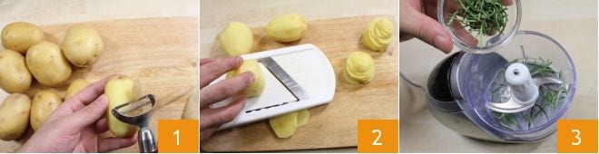 Para preparar as torres de batatas assadas, lave e descasque cuidadosamente as batatas 1, em seguida, corte-as em fatias finas (cerca de 3 mm) usando um mandolim 2 (se não tiver, você pode fazer a mesma operação com uma faca). Tome cuidado para cortar as batatas mantendo-as retas, para obter fatias que sejam o mais redondas e regulares possível. Pique o alecrim finamente com um mixer 3 e comece a montar as torres: