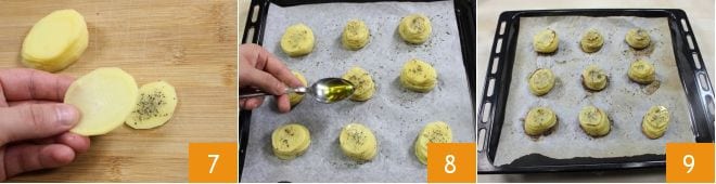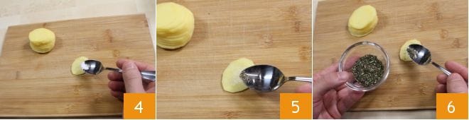 coloque na primeira fatia de batata sal 4, pimenta 5 e uma pitada de alecrim picado 6,