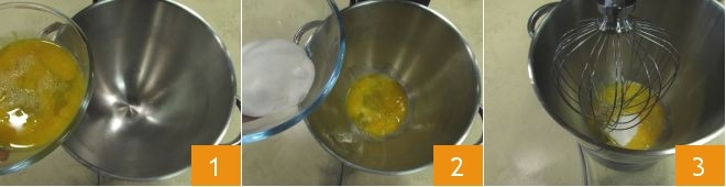 Para preparar o bolo de ricota e pera, comece derretendo 75 g de manteiga em fogo muito baixo e depois deixe amornar. Enquanto isso, coloque os ovos em uma batedeira com batedores 1, adicione o açúcar 2, 1/3 das sementes da fava de baunilha e comece a bater em velocidade moderada 3; bata por cerca de 10 minutos.