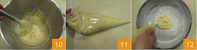 Misture de baixo para cima para incorporá-la 10, em seguida, despeje a massa obtida em um saco de confeitar com bico liso 11. Pré-aqueça o forno a 205ºC em modo estático. Unte e enfarinhe duas formas de 22 cm de diâmetro, então crie uma camada de massa no fundo, começando do centro com um movimento em espiral 12