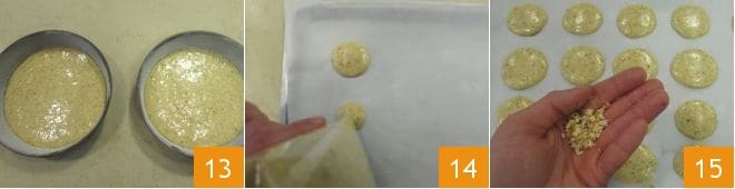 e expandindo-se gradualmente por toda a superfície: assim você obterá duas bases perfeitas 13. Neste ponto, com a massa restante, você pode fazer biscoitinhos que servirão para a decoração final do bolo: coloque uma folha de papel manteiga em uma assadeira, então comece a formar discos com a massa restante, espaçando-os alguns centímetros, para que não grudem durante o cozimento 14. Serão cerca de vinte. Polvilhe-os com a granola de avelã 15.