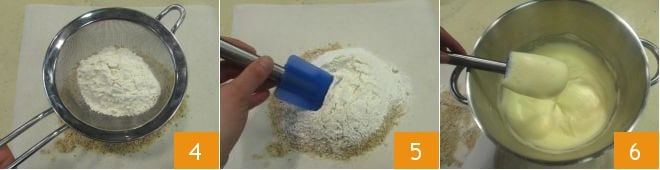 Em uma folha de papel manteiga, transfira a farinha de avelã de Giffoni, peneire a farinha de trigo 00 por cima 4 e misture com uma espátula para incorporar 5. Quando a mistura de ovos e açúcar estiver bem batida, clara e espumosa 6,