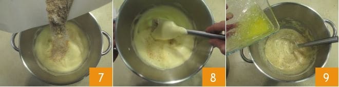 adicione as farinhas em duas vezes 7, misturando com a espátula de cima para baixo para incorporar sem desmontar a mistura 8, em seguida, adicione a manteiga derretida em fio, já em temperatura ambiente 6.